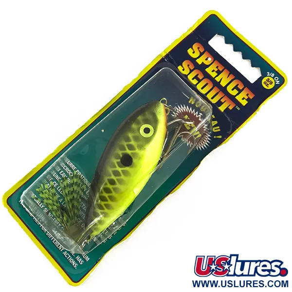 Mit einem markanten Schuppenmuster in Chartreuse und Schwarz sowie einem auffälligen Seitenpunkt (Farbe 245 535) ausgestattet, befindet sich dieser 10,5 g (3/8 oz) schwere Köder in der Originalverpackung. Mit einer Länge von 6,5 cm (2 1/2") ist der Strike King Spence Scout (Artikelnummer 7403) ein schwimmender, geräuschvoller Köder, der für Präsentationen an und knapp unter der Wasseroberfläche entwickelt wurde. Diese spezielle "New Scout"-Version zeichnet sich durch zwei Einhängepositionen aus, die je nach verwendetem Ring unterschiedliche Lauftiefen zwischen 0,3 und 0,9 m (1-3 ft) ermöglichen. Hergestellt in Mexiko, ist das Exemplar unbenutzt und befindet sich im Originalzustand (Bewertung 6). Das gut sichtbare gelbe Auge und das gitterartige Schuppenmuster an den Seiten sorgen für ein kontrastreiches Profil, ideal für das Angeln auf Barsch in trübem Wasser.