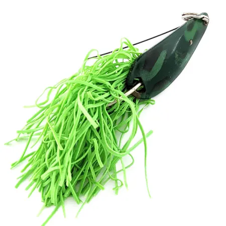Mit einem Gewicht von 11 g (2/5 oz) ist dieser spezielle Strike King Timber King ein hervorragendes Beispiel für ein hängerfreies Köderdesign. Der dunkelgrüne Körper im Camouflage-Muster misst 4,5 cm (1 3/4") und ist mit einem dichten, leuchtend grünen Gummifransen-Skirt kombiniert, der für eine markante Silhouette sorgt. Die Konstruktion wurde für das Angeln in dichtem Bewuchs entwickelt und verfügt über einen einzelnen, nach oben gerichteten Haken, der durch einen doppelten Krautschutzbügel vor Hindernissen und Totholz geschützt wird. Ein robuster Sprengring aus Metall an der Nase sorgt für eine sichere Verbindung beim Fischen. Dieser Artikel mit dem Produktcode 20554 befindet sich in einem exzellenten Zustand mit einer Bewertung von 5/5. Der aus den USA stammende Köder verkörpert die funktionale Handwerkskunst, die charakteristisch für die Marke Strike King ist.