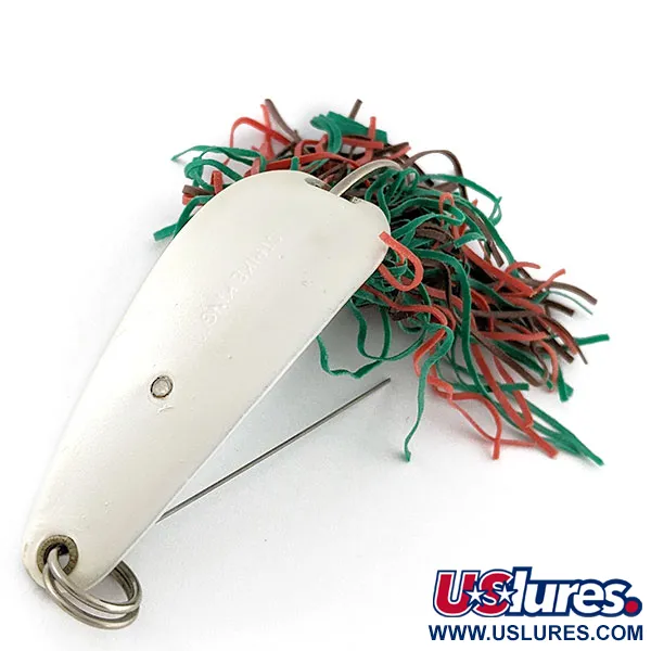 Ein Metallkörper im Perlmutt-Finish mit einem Gewicht von 1/2 oz (14 g) zeichnet dieses Exemplar des Timber King von Strike King aus. Mit einer Länge von 2 1/4" (5,5 cm) trägt der Köder den sauber in die Oberseite eingestanzten Namen des Herstellers. Für das Angeln in dichter Vegetation verfügt das Design über einen festen Draht-Krautschutz, der einen Einzelhaken schützt, welcher mittels einer Verschraubung fest im Körper integriert ist. Der Schwanzbereich ist mit einem dichten Gummiskirt ausgestattet, der aus roten, grünen und braunen Fransen besteht. Mit einer Bewertung von 5/5 präsentiert der Köder ein hervorragend erhaltenes Finish sowie geschmeidige Gummikomponenten. Jedes Detail, vom stabilen Sprengring an der Köderspitze bis hin zur Hardware auf der Unterseite, spiegelt seine US-amerikanische Herkunft wider. Dieser spezifische Artikel wird unter dem Produktcode 21094 geführt.
