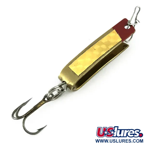 Eine vergoldete Oberfläche und eine leuchtend rote Spitze prägen das optische Erscheinungsbild des South Bend Super-Duper 501, der unter dem Produktcode 9537 geführt wird. Mit einem Gewicht von 3/32 Unzen (2,3 g) und einer Länge von 1 1/4" (3 cm) zeichnet sich dieser in den USA hergestellte Köder durch seine markante U-förmig gefaltete Metallkonstruktion aus. Ein strukturierter, holografischer Goldfolienstreifen auf einer Seite sorgt für verstärkte Lichtreflexionen. Das Exemplar befindet sich in einem 5/5-Zustand mit einer sauberen Oberfläche, in die der Markenname 'SUPER-DUPER' deutlich eingestempelt ist. Zur Ausstattung gehören ein stabiler Drillingshaken, der an einem Sprengring befestigt ist, sowie ein Drahtwirbel am Kopf für eine einfache Verbindung mit der Schnur. Das Gesamtdesign stellt eine einzigartige Mischung aus Löffel- und Spinnerelementen dar, die charakteristisch für die Fertigungsmethoden von South Bend in der Mitte des Jahrhunderts ist.