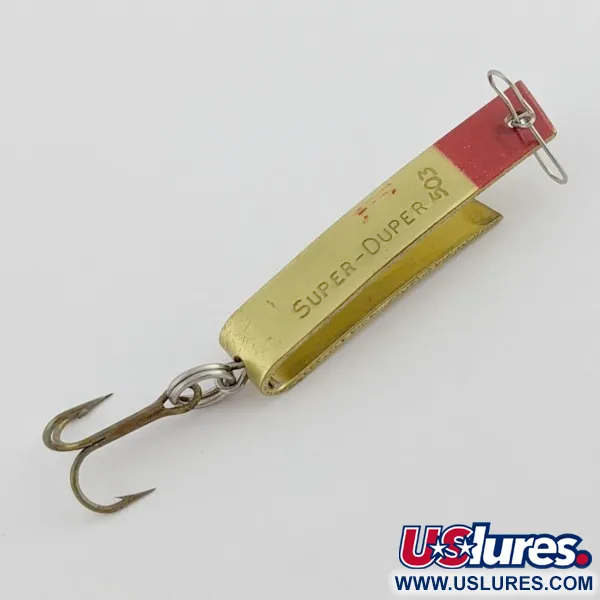Eine leuchtend rote Spitze bildet einen scharfen Kontrast zum goldfarbenen Metall dieses klassischen U-förmigen Blinkers. Direkt in den Körper eingestempelt ist der Name SUPER-DUPER 503 zusammen mit der Patentnummer 2719378, was auf das authentische Luhr Jensen Erbe hinweist. Dieses in den USA hergestellte Exemplar weist eine schwarze Beschriftung auf, die scharf geblieben ist, was zu seinem 5/5-Zustand beiträgt. Das unkonventionelle gefaltete Design wurde entwickelt, um beim Schleppen oder Werfen an leichter Schnur effektiv Druck im Wasser aufzubauen. Alle Originalteile sind vorhanden, einschließlich eines Drillings, der über einen Sprengring befestigt ist, und eines Drahthakens am Ende der Schnurbefestigung. Dieses Modell, das oft in der Ausrüstung engagierter Forellen- und Barschangler zu finden ist, ist ein wesentliches Stück Angelgeschichte aus der Mitte des Jahrhunderts. Die Goldbeschichtung behält ihren ursprünglichen Glanz über die gesamte Länge des gefalteten Metallrahmens bei. Dieser Artikel ist unter dem Produktcode 24435 katalogisiert.