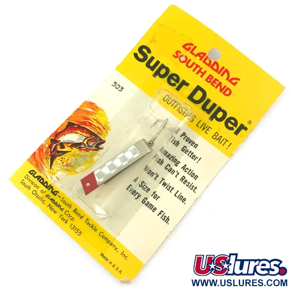 Vernickelte Oberflächen gepaart mit einer kräftigen roten Spitze und einem weißen Karomuster zeichnen diesen klassischen amerikanischen Köder aus. Unter dem Code 4661 gelistet, wiegt dieser South Bend Super-Duper 503 1/8 oz (4,3 g) und ist 1 1/2 Zoll (3,5 cm) lang. Dieses spezielle Exemplar ist unbenutzt und in der originalen gelben Verpackung aus der Gladding-Ära aus dem Werk in South Otselic, New York, erhalten. Der dünne Metallkörper ist in der ikonischen U-Form gebogen, die den Super-Duper seit Jahrzehnten zu einem festen Bestandteil für Forellen- und Barschangler macht. Das Nickel / Rot-Farbschema ist weiterhin kräftig und zeigt die hochwertige Beschichtung, die typisch für die South Bend-Produktion der Mitte des Jahrhunderts ist. Ein einzelner Nachläuferhaken ist sicher am Ende befestigt, konzipiert für das Werfen oder Schleppen an feiner Schnur.