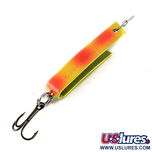 UV-Eigenschaften prägen den Super-Duper 503 UV, was sich in der lebhaften Reaktion seiner chartreuse- und orangeroten Lackierung unter ultraviolettem Licht zeigt. Mit einer Länge von 1 1/4" (3 cm) basiert dieser kompakte, in den USA gefertigte Köder von South Bend auf einem einzigen gebogenen Metallblatt – eine Designentscheidung, die ihn von herkömmlichen Blinkern abhebt. Der eingestanzte Schriftzug „SUPER-DUPER“ ist auf der Seite deutlich sichtbar und unterstreicht die Tradition eines Modells, das die Lücke zwischen Spinner und Wurflöffel schließt. Mit einem Gewicht von 1/8 oz (4,3 g) ist er ideal für ultraleichtes Angeln auf Forellen oder Barsche geeignet. Dieses Exemplar befindet sich in exzellentem Zustand (Bewertung 5/5), wobei das Originallackierung kräftig bleibt und die Hardware – einschließlich des hinteren Drillings und des oberen Drahtsnaps – keinerlei Gebrauchsspuren aufweist. Dieses spezifische Modell 503, unter dem Produktcode 12331, verfügt über eine UV-reaktive Beschichtung, die für hohe Sichtbarkeit in tieferen oder trüben Gewässern sorgt.