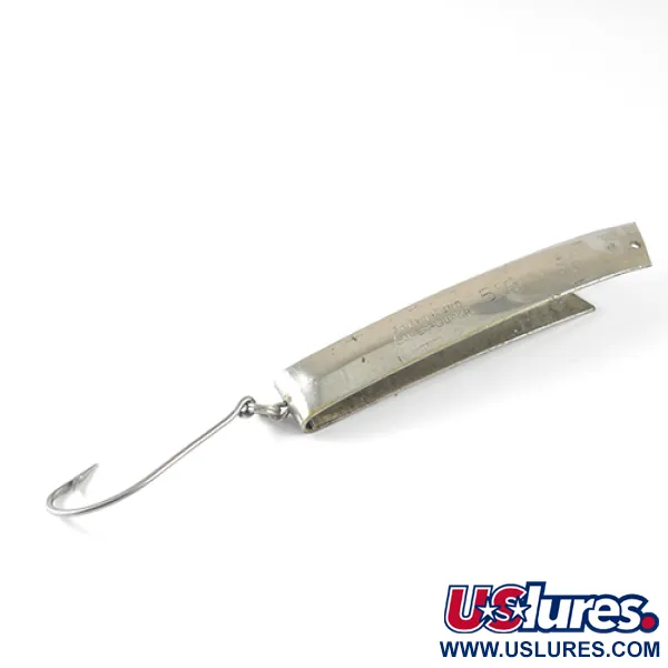 Deutlich in die vernickelte Oberfläche dieses South Bend Klassikers eingeprägt ist die Patentnummer 2.719.378, die ihn als echtes Zeugnis der Angelgeschichte aus der Mitte des 20. Jahrhunderts ausweist. Dieses 8,5 cm (3 1/4") lange Exemplar, geführt unter dem Code 1721, repräsentiert eine faszinierende Ära des amerikanischen Köderdesigns, in der Einfachheit auf Effektivität traf. Das Modell Super-Duper 516 ist aus einem einzigen, gefalteten Metallstreifen gefertigt und mit einem hellen Nickel-Finish versehen, das das Licht reflektiert. Mit einem Gewicht von 18g (2/3oz) liegt es solide in der Hand und ist mit einem großen Einzelhaken ausgestattet, der durch einen stabilen Sprengring verbunden ist. Die Prägung auf der Seite ist bemerkenswert tief und lesbar und zeigt „SOUTH BEND SUPER-DUPER 516“. Der Zustand des Köders ist mit 4/5 bewertet, mit nur geringen Oberflächenspuren bei vollem Erhalt des ursprünglichen Metallglanzes. Eine einzelne Aufhängung ist präzise an der Vorderkante für die Schnurverbindung gebohrt.