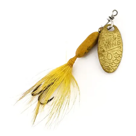 Auf dem messingfarbenen Spinnerblatt ist die Größenbezeichnung „0“ deutlich eingeprägt, was diesen Köder als klassischen Swiss Swing 0 von Renosky Lures kennzeichnet. Mit einer Gesamtlänge von 4,5 cm verfügt der Spinner über ein strukturiertes ovales Blatt mit einem markanten Schuppenmuster, das einen Kontrast zum glatten, gelb lackierten Körper bildet. Die Konstruktion stammt aus Frankreich und spiegelt hochwertige europäische Fertigungsstandards wider, was an der präzisen Drahtwicklung am Öhr erkennbar ist. Diese gefiederte Variante besitzt einen mit leuchtend gelben Federn bestückten Drillingshaken, der farblich auf das 1,7 g schwere Gewicht abgestimmt ist. Unter dem Produktcode 12612 gelistet, befindet sich das Sammlerstück in einem Zustand von 5/5 und weist für sein Alter eine hervorragend erhaltene Lackierung sowie Hardware auf. Der Clevis-Bügel lässt das Blatt eng am Achsdraht rotieren, ein typisches Merkmal für Spinner dieser speziellen Größe und Kategorie.