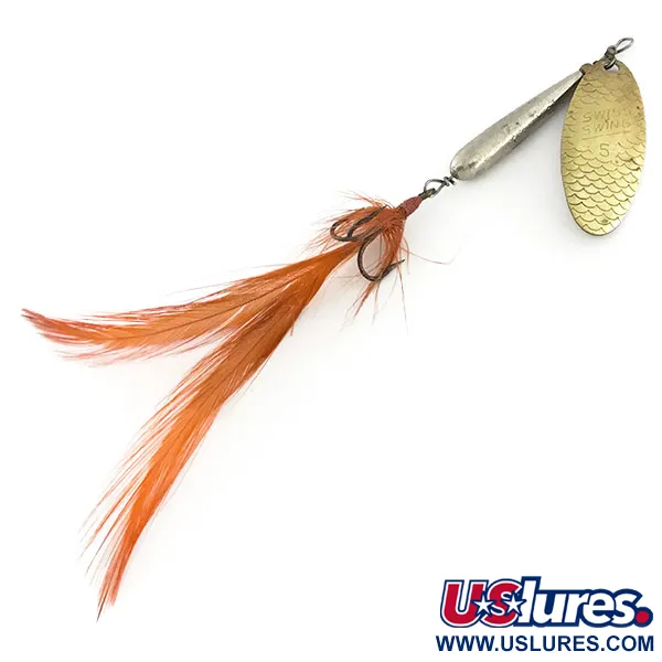 Mit einer Gesamtlänge von 8 cm (3 1/4") bietet das Messing-Spinnerblatt mit Schuppenmuster eine markante Textur, die das Licht anders einfängt als eine glatte Oberfläche. Eine leuchtend orangefarbene Hechelfeder ist sorgfältig um den Drillingshaken dieses in Frankreich hergestellten Exemplars gebunden, das unter dem Produktcode 9438 geführt wird. Der vernickelte, tropfenförmige Körper liefert das für stabiles Werfen notwendige Gewicht von 9 g (1/3 oz). Renosky Lures brachte diese europäischen Designs auf den Markt, und das Blatt ist deutlich mit der Kennzeichnung 'Swiss Swing 5' geprägt, was seine Herkunft unterstreicht. Jede Komponente bleibt in ausgezeichnetem Zustand, wobei die Metalloberflächen und die Befiederung sehr gut erhalten wirken und eine Bewertung von 5/5 verdienen. Die Drahtkonstruktion ist gerade und der Gabelbügel ermöglicht es dem Messingblatt, ordnungsgemäß gegen den Nickelkörper zu sitzen.