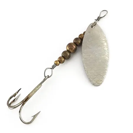 Ein markantes Schuppenmuster ist auf das silberne Blatt dieses 4 g (1/8 oz) Renosky Lures Swiss Swing geprägt. Dieser Köder mit der Artikelnummer 9171 hat eine Gesamtlänge von 7 cm (2 3/4"). Der Körper besteht aus einer Reihe von sechs abgestuften Messingperlen, die das nötige Gewicht für weite Würfe und die Tiefenkontrolle bieten. Der Drillingshaken ist sicher an der hinteren Drahtöse befestigt, was die für Renosky typische solide Verarbeitungsqualität unterstreicht. Die Rückseite des Blattes ist glatt und poliert, um einen hellen Lichtreiz zu erzeugen. Dieses Exemplar befindet sich in einem Zustand von 5/5, wobei die Drahtwicklungen an der oberen Öse und der Hakenbefestigung fest und sicher sitzen. Die Kombination aus der Textur des Silberblattes und den Messingperlen macht ihn zu einem klassischen Beispiel für das Design traditioneller Inline-Spinner.