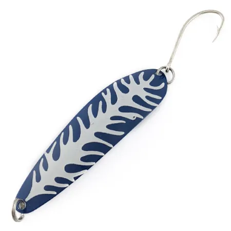 Ein Gewicht von 1/4 oz (8 g) macht diesen schlanken Blinker zu einer vielseitigen Wahl für Angler, die es auf Raubfische abgesehen haben, die sich auf kleinere Beutefische spezialisiert haben. Mit einer Länge von 3 1/2" (9 cm) ist der Hookster Totem #4 ein klassisches Beispiel amerikanischer Köderbaukunst aus dem Hause Producers. Das Dekor ist besonders auffällig und besteht aus einer tiefblauen Grundierung, die mit einem silbernen Skelettmuster überzogen ist, welches kräftig und scharf erhalten geblieben ist. Dieses spezielle Exemplar mit dem Produktcode 23108 befindet sich in einem hervorragenden Originalzustand (Bewertung 5/5) mit bestens erhaltenen Lackflächen und einem glänzenden, großen Einzelhaken am Ende. Die Rückseite des Köders bietet eine kontrastierende, mattsilberne Oberfläche, während die stabilen Sprengringe an beiden Enden sofort einsatzbereit sind. Sein schmales, leicht geschwungenes Profil ist ein Markenzeichen der Totem-Serie und wurde für präzises Werfen und Einholen entwickelt.