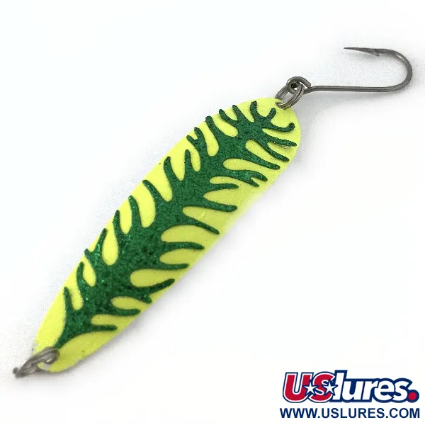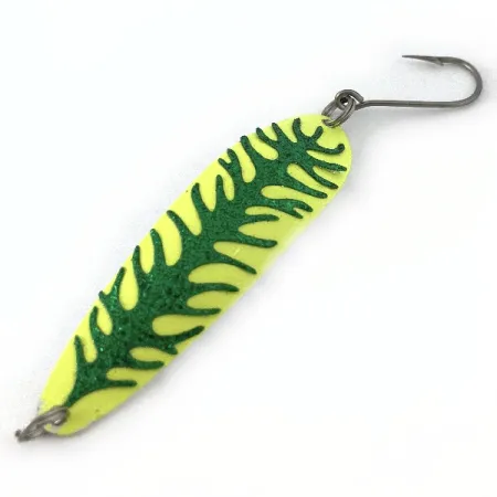 Mit einer Länge von 9 cm (3 1/2") von der Spitze bis zum Ende zeichnet sich dieser schlanke Blinker durch eine gut sichtbare gelbe Grundfarbe aus, die darauf ausgelegt ist, selbst in trübem Wasser Licht einzufangen. Der The Producers Hookster Totem #4, gelistet unter dem Produktcode 23480, besticht durch sein einzigartiges grünes Glitzermuster entlang der Körpermitte, das eine strukturierte, mehrdimensionale Optik erzeugt. Dieser in den USA hergestellte 8 g (1/4 oz) schwere Köder ist am Heck mit einem stabilen Einzelhaken bestückt, der über einen robusten Sprengring für maximale Zuverlässigkeit beim Wurf montiert ist. Der Zustand dieses speziellen Exemplars ist 5/5, es ist außergewöhnlich sauber und das Original-Finish ist vollständig erhalten. Dieses Design von Producers setzt auf ein schlankes Profil und hohen Farbkontrast für eine gezielte Präsentation beim Angeln auf Süßwasser-Raubfische.