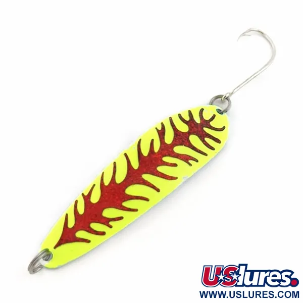 Leuchtendes Chartreuse-Gelb dient als weithin sichtbare Basis für das markante rote Glitzer-Dekor dieses in den USA gefertigten Blinkers. Mit einer Länge von 9 cm (3 1/2") und einem Gewicht von 8 g (1/4 oz) repräsentiert der Producers Hookster Totem #4 eine besondere Ära amerikanischer Handwerkskunst der Marke Producers. Das Exemplar weist ein tiefrotes, grätenartiges Muster mit Metallic-Glitzer-Finish auf, das sich deutlich vom gelben Körper abhebt. Unter dem Produktcode 23795 gelistet, befindet sich dieser Köder in einem 5/5-Zustand mit sauberer Oberfläche und originaler Bestückung. Die Ausstattung umfasst einen Einzelhaken aus Edelstahl, der per Sprengring am Heck montiert ist, sowie einen entsprechenden Sprengring an der Spitze für die sichere Verbindung zur Schnur. Das schlanke Profil ist für den vielseitigen Einsatz beim Spinnfischen oder Schleppen unter verschiedensten Lichtverhältnissen konzipiert.
