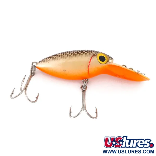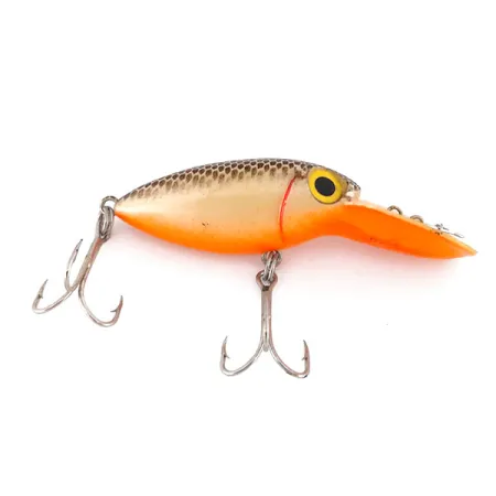 An der unteren Hälfte dominiert leuchtendes Orange, das in ein wunderschön ausgearbeitetes silber-goldenes Schuppenmuster über den gewölbten Rücken übergeht. Dieser Willy’s Worm, hergestellt von The Producers in den USA, trägt den Produktcode 9588 und befindet sich im Zustand 5/5. Mit einer Länge von 2" (5 cm) und einem Gewicht von 1/4 oz (8 g) zeichnet sich dieser Köder durch seine markante, übergroße Tauchschaufel aus, die für Präsentationen im tiefen Wasser konzipiert wurde. Die großen gelben Augen mit den markanten schwarzen Pupillen sind ein Markenzeichen dieses Modells und bilden einen auffälligen Fokuspunkt auf dem strukturierten Schuppendekor. Zur Originalausstattung gehören zwei silberne Drillingshaken, von denen einer am Bauch und einer am Schwanz montiert ist. Ein bereits montierter Snap an der breiten, abgerundeten Schaufel garantiert den Auslieferungszustand ab Werk. Der Übergang vom hellen orangefarbenen Bauch zur dunkleren, metallischen Oberseite spiegelt die hochwertige Fertigung dieser Ära wider.