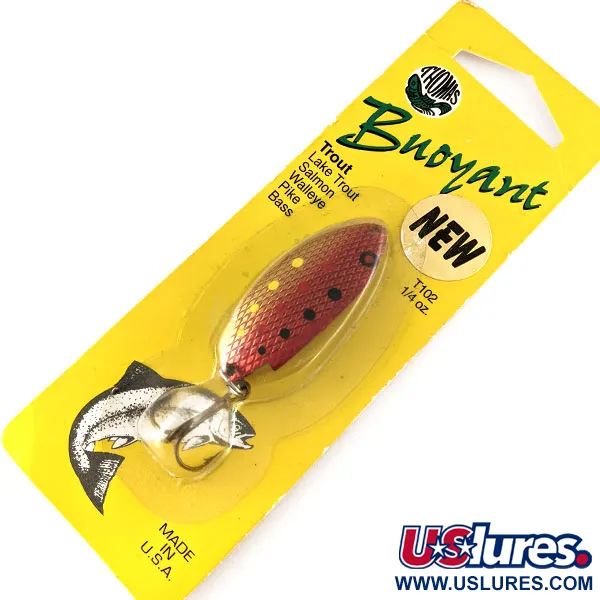 Ein präzises Gewicht von 1/4 oz (7 g) macht diesen Thomas Buoyant zu einem Standardköder für Angler an Gebirgsbächen, die Forellen und Lachse bejagen. Dieses Exemplar mit dem Produktcode T102GR zeichnet sich durch ein markantes gehämmertes Gold/Rot-Finish aus, das die Färbung einer Forelle imitiert, ergänzt durch gelbe und schwarze Punkte auf dem Metall mit Schuppenmuster. Hergestellt in Hawley, Pennsylvania, misst der Köder 1 3/4" (4.5 cm) und befindet sich in unbenutztem Zustand in der gelben Originalverpackung. Thomas Spinning Lures hat diese spezielle Form als Blinker konzipiert, der bei mäßig langsamem Einholen die fluchtartige Bewegung eines Beutefisches nachahmt. Die Ausstattung umfasst einen scharfen Drilling, der über einen stabilen Sprengring befestigt ist. Der Hersteller empfiehlt die Verwendung eines Duolock-Snaps oder eines Schlaufenknotens, um das optimale Laufverhalten des Köders zu gewährleisten. Dieser amerikanische Klassiker trägt die Modellnummer T102 auf dem vorderen Aufkleber und die Farbbezeichnung auf der Rückseite.