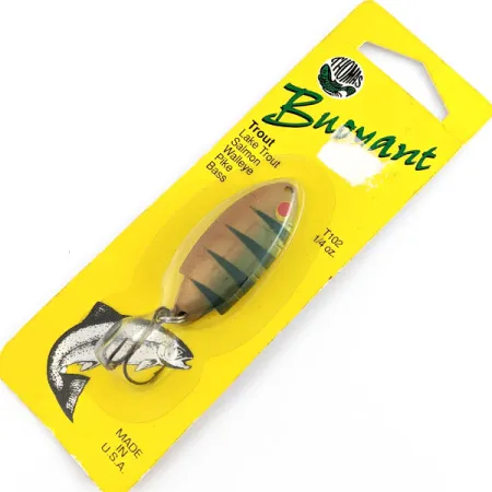 Mit einer Länge von genau 4,5 cm (1 3/4") präsentiert sich der Thomas Buoyant im klassischen Barsch-Dekor mit dunklen vertikalen Streifen auf einem messing-goldenen Grund. Dieses Exemplar mit der Artikelnummer 22043 ist ein unbenutztes Stück amerikanischer Handwerkskunst, noch originalverpackt auf der gelben Kartonkarte. Mit einem Gewicht von 7 g (1/4 oz) ist der Blinker mit einem hochwertigen Finish gefertigt, das Lichtreflexe optimal einfängt und ein flüchtendes Beutetier simuliert. Ein leuchtend roter Punkt als Akzent befindet sich am abgerundeten Kopfbereich, während das Ende mit einem scharfen Drillingshaken ausgestattet ist. Hergestellt von Thomas Spinning Lures in Hawley, Pennsylvania, steht dieser Köder in einer Designtradition, die bereits 1946 patentiert wurde. Die Verpackung weist auf die besondere Fängigkeit bei Fischarten wie Forelle, Lachs und Zander hin, was die Vielseitigkeit dieser Konstruktion unterstreicht.