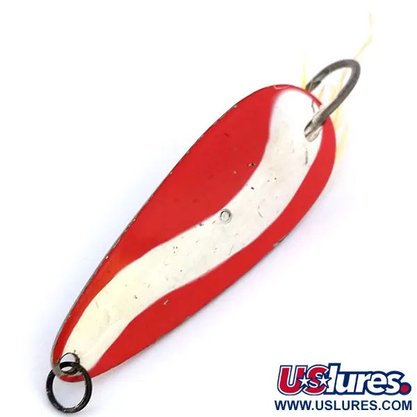 Ein wellenförmiges rot-weißes Emaillemuster ziert die konvexe Seite dieses vernickelten Blinkers – ein Design, das stellvertretend für das US-Angeln der Jahrhundertmitte steht. Dieser Tony Accetta Weed Doger mit dem Code 10607 wiegt 1/3 Unze (10g) und ist 2 1/4" (5,5 cm) lang. Die konkave Seite zeigt eine saubere, gestempelte "TONY ACCETTA"-Markierung sowie einen Einzelhaken, der mit einem gelben Feder-Trailer an rotem Faden ausgestattet ist. Um das Fischen in dichten Krautbetten zu ermöglichen, verfügt das Terminal Tackle über einen Draht-Krautschutz. In einem Zustand von 4/5 zeigt der Löffel leichte Gebrauchsspuren, die von seiner Geschichte zeugen, während das Metall glänzt und die Farbe kräftig bleibt. Ein einfacher schwarzer Sprengring ist an der vorderen Öse für die Schnurverbindung angebracht.