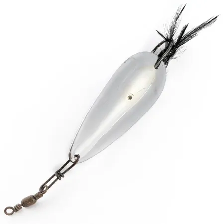 Eine schwere Vernickelung bildet die Basis für diesen 21 g (3/4 oz) schweren Blinker und sorgt für eine hohe Sichtbarkeit sowie Korrosionsbeständigkeit. Dieser in den USA hergestellte Tony Accetta Weed Doger, identifiziert durch die Artikelnummer 23270, ist eine bemerkenswerte Rarität für jeden Liebhaber von Angelgeräten aus der Mitte des letzten Jahrhunderts. Das Design zeichnet sich durch einen Einzelhaken aus, der durch einen steifen Krautschutz aus Draht geschützt ist – speziell konzipiert für Würfe in dichten Bewuchs oder Seerosenfelder. Ein Büschel dunkler Federn ist am Hakenschenkel gebunden und sorgt für eine markante Silhouette vor dem polierten Metall. Auf der Rückseite ist der Name 'TONY ACCETTA' gut lesbar in das Nickel-Finish eingeprägt. Der Köder ist an der Spitze mit einem Wirbel für eine einfache Befestigung der Schnur ausgestattet. Mit einem Zustand von 4/5 weist das Sammlerstück eine sehr saubere Oberfläche mit gut erhaltenen Komponenten und scharfen Markierungen auf.