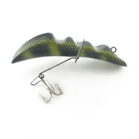 Ein markantes Hecht-Dekor mit einer feinen Waben-Schuppentextur bedeckt den geschwungenen, wellenförmigen Körper dieses Bradson-Köders. Mit einer Länge von 9,5 cm (3 3/4") und einem Gewicht von 12 g (2/5 oz) weist der Köder eine Reihe charakteristischer Höcker auf, die sein einzigartiges Profil definieren. Die dunklen vertikalen Streifen und grün-gelben Farbtöne sind über einem Schuppendruck-Netz aufgebracht, was ein naturgetreues Erscheinungsbild für verschiedenste Wasserbedingungen schafft. Die Ausstattung umfasst eine bauchseitig montierte Drahtkonstruktion, die einen einzelnen Drilling unter dem Körper positioniert und durch eine zentrale Metallklammer gesichert wird. Dieser spezielle Vintage Bradson Wave fish (Produktcode: 23625) ist außergewöhnlich gut erhalten und erhält aufgrund seiner sauberen Oberflächen und der intakten Hardware eine Zustandsbewertung von 5/5. Die Schnurbefestigung befindet sich ganz vorne an dem segmentierten, gerippten Rahmen, was typisch für die kreative Ingenieurskunst amerikanischer Köderdesigns aus der Mitte des Jahrhunderts ist.