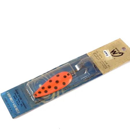 Ein lebhaftes rot-schwarzes Punktmuster kennzeichnet diesen Weber Spoon sofort als Klassiker aus der Mitte des Jahrhunderts von der Weber Tackle Company aus Stevens Point, Wisconsin. Mit einem Gewicht von 11 g (2/5 oz) und einer Länge von 6 cm (2 1/4") ist dieses Sammlerstück unter dem Produktcode 2802 katalogisiert. Der Köder befindet sich in unbenutztem Zustand in der blauen und beigefarbenen Originalverpackung mit dem Slogan „Weber Makes It—A Fish Takes It“. Während Haken und Finish sauber sind, weist die Vintage-Verpackung altersgemäße Lagerspuren auf. Seine einfache Tropfenform und der hinten montierte Drilling wurden für vielseitige Einsatzmöglichkeiten beim Werfen und Schleppfischen entwickelt. Dieses seltene Exemplar ist eine greifbare Verbindung zum Erbe eines der bekanntesten Angelgerätehersteller der USA.