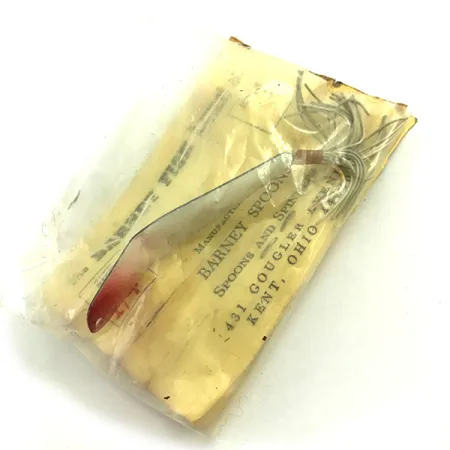Weißer Lack, der in eine leuchtend rote Spitze übergeht, überzieht den verjüngten Metallkörper dieses 1/4oz (7g) schweren Köders. Hergestellt von der Gougler Line Mfg. Co. in der Gougler Ave 431 in Kent, Ohio, wurde der Weedless Barney Spoon speziell für das Angeln in dichten Krautfeldern entwickelt. Dieses 2 1/4" (5,5 cm) lange Modell verfügt über einen Einzelhaken, der durch einen Krautschutz aus Metall geschützt ist, und ist mit einem weißen, mehrsträngigen Gummiskirt ausgestattet. Sein Design ermöglicht den vielseitigen Einsatz beim Auswerfen, Schleppen und Jiggen und wurde sogar beim vertikalen Eisangeln verwendet. Unter dem Code 5739 geführt, ist dieser Köder unbenutzt und in seiner klaren Originalverpackung erhalten.