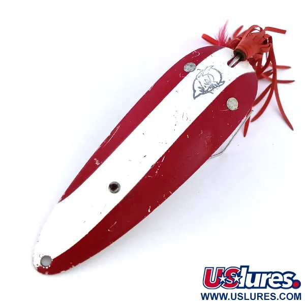 Rot-weiße Streifen prägen die Vorderseite dieses 28g (1oz) schweren Blinkers, der genau 9cm (3 1/2") lang ist. Dieser von Eppinger hergestellte und unter dem Produktcode 10692 geführte Weedless Dardevle zeigt das klassische Devil Dog-Logo, das in die weiße Farbe eingestempelt ist. Die Rückseite ist in poliertem Nickel gehalten, was für hohen Kontrast und Sichtbarkeit bei verschiedenen Lichtverhältnissen sorgt. Ein Doppel-Draht-Krautschutz ist mit Nieten am Körper befestigt, um dem Einzelhaken den Weg durch dichte Vegetation und Unterwasserhindernisse zu ebnen. Der Schwanz ist mit einem roten Skirt aus Hechelfedern und Gummifäden ausgestattet, um die optische Reizwirkung zu erhöhen. Der Zustand wird mit 5/5 bewertet, wobei altersbedingte Oberflächenspuren und kleine Lackabplatzer an den Rändern sichtbar sind. Ursprünglich ab 1906 in Lou Eppingers Keller in Detroit handgefertigt, erlangten diese Köder für ihre Effizienz einen so guten Ruf, dass sie in Überlebenskits der Luftfahrt während der Kriegszeit aufgenommen wurden. Der schwere Metallkörper ist perfekt ausbalanciert für weite Würfe in dichtes Cover.
