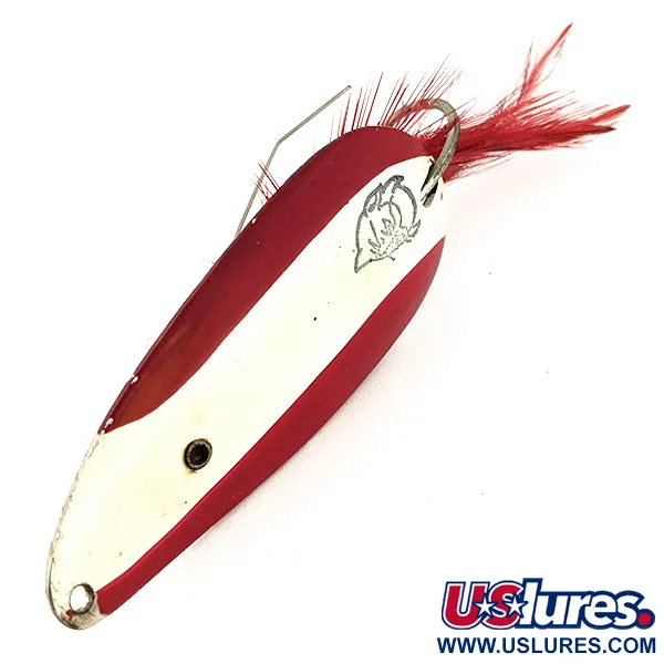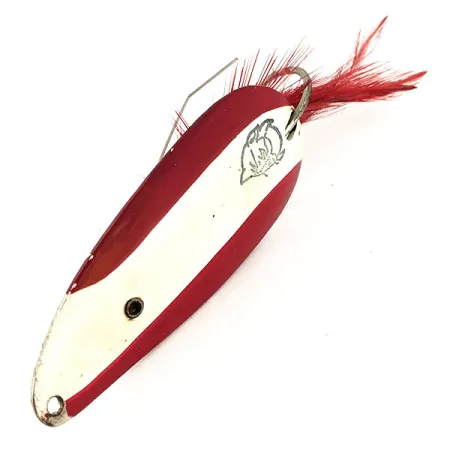 Lebhafte rote und weiße Streifen auf der konvexen Oberfläche prägen diesen 21g (3/4oz) Blinker aus der legendären Eppinger-Serie. Mit einer Länge von genau 7cm (2 3/4") trägt dieser Weedless Dardevle Dardevlet, Artikelcode 12702, die klassische Teufelskopf-Grafik, die direkt auf den weißen Lack gestempelt ist. Eppinger fertigt diese seit 1906 in Michigan, und die robuste Bauweise dieses Modells mit Nickel-Rückseite zeugt von deren Fertigungsstandards. Diese Version ist speziell für dichten Bewuchs konzipiert und verfügt über einen Doppeldraht-Krautschutz, der den Einzelhaken vor Hängern in der Vegetation bewahrt. Ein karmesinroter Federschwanz ist sicher am Hakenschenkel gebunden und bietet eine weiche Textur vor der polierten Nickel-Innenseite. Im aktuellen Zustand 5/5 bleibt der Lack makellos und die Metalloberflächen behalten ihren Hochglanz. Die werkseitige Öse am schmalen Ende ist bereit für einen Sprengring, positioniert für einen stabilen Lauf bei langsamer Führung durch Seerosen oder Holz.