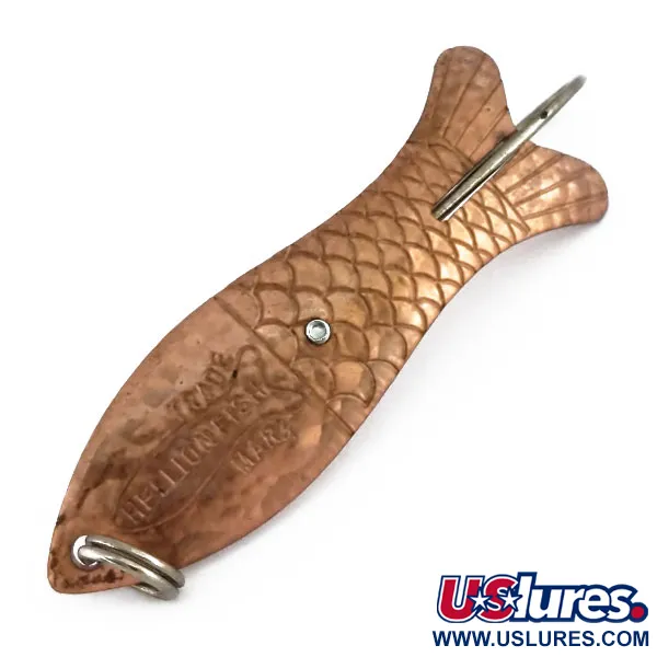 Auf dem kupferfarbenen Körper ist das klassische Branding 'TRADE HELLION FISH MARK' deutlich eingestempelt, was diesen Vintage-Blinker kennzeichnet. Der Weedless Hellion Fish Crystal, Produktcode 9729, misst 2 3/4" (7 cm) und wiegt 2/5 oz (12 g). Sein markantestes Merkmal ist das zentrierte 'Crystal'-Auge, ein kleiner eingelassener Glasstein, der einen Kontrast zu dem in das Metall geprägten detaillierten Schuppenmuster bildet. Dieser in den USA hergestellte Köder wurde für das Angeln in Hindernissen entwickelt und verfügt über einen stabilen Krautschutz aus Draht, der den integrierten Einzelhaken vor Hängern schützt. Die tiefe Wölbung des Blinkers ist im Profil sichtbar, kombiniert mit einer Fischschwanz-Silhouette und einem hochbelastbaren Sprengring für die Schnurbefestigung. Dieses spezielle Exemplar befindet sich in einem 5/5-Zustand und weist ein sauberes, gleichmäßiges Finish auf dem Metallkörper auf.