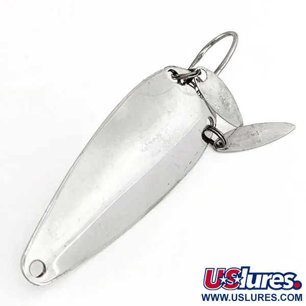 Vernickelte Oberflächen dieser 12 g (2/5 oz) schweren Blinker sorgen für einen kontrastreichen Lichtreflex, der Beutefische imitiert. In der Nähe des Hakens sind zwei längliche „Sonic Blades“ angebracht, die für zusätzliche visuelle Reize sorgen und den Haken tarnen. Auf der Unterseite befinden sich die Prägungen „MARATHON“ und „USA“, Markenzeichen der Qualitätsfertigung der Marathon Bait Company aus Wisconsin zwischen 1929 und 1979. Mit einer Länge von 6 cm (2 1/4") ist das Profil des Köders speziell für das Auswerfen in dichte Vegetation konzipiert, unterstützt durch den integrierten Krautschutz aus Draht, der den Einzelhaken schützt. Der Zustand ist eine solide 5/5, mit hellem Glanz und scharfen Komponenten am gesamten Körper sowie an den Zusatzblättern. Der Artikelcode 11343 steht für ein funktionales Beispiel klassischer Angeltechnik, das auf hängerfreies Fischen spezialisiert ist.