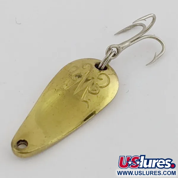 Ein gestempeltes „W“ in verzierter Schrift auf der konvexen Seite kennzeichnet diesen 1/8 oz (3,5 g) Löffelblinker als echten Weller Gypsy King Deluxe. Der kompakte, tropfenförmige Körper misst 1 Zoll (2,7 cm) und verfügt über ein warmes Messingfinish, das hell und reflektierend bleibt. Unter der Artikelnummer 24521 geführt, zeigt dieser Metallköder die präzise Stanzung und die glatten Kanten, die typisch für amerikanisches Angelgerät aus der Mitte des Jahrhunderts sind. Ein einzelner Drilling ist direkt an der hinteren Öffnung des massiven Metallrahmens montiert. Dieses spezielle Exemplar weist eine Zustandsbewertung von 5/5 auf und zeigt keine nennenswerten Abnutzungserscheinungen an den polierten Oberflächen oder den eingravierten Details.