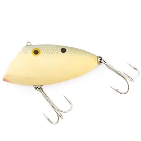 Das blasscremefarbene Finish dieses klassischen 6,5 cm (2 1/2") langen Körpers geht am Rücken in ein feines Netzschuppenmuster über. Mit einem Gewicht von 14 g (1/2 oz) besitzt dieser Whopper Stopper Bayou Boogie (Produktcode 23278) die markante rote Kinnpartie, ein klassisches Erkennungsmerkmal vieler US-amerikanischer Lipless-Köder. Handbemalte gelbe Augen mit großen schwarzen Pupillen bilden einen kontrastreichen Blickfang, ergänzt durch einen einzelnen dunklen Punkt auf der Flanke zum Schwanz hin. Dieses in den USA hergestellte Exemplar hat einen Zustand von 4/5 und weist leichte Altersspuren auf, während die Anbauteile intakt sind. Zwei originale Drillingshaken sind an stabilen Ösen am Bauch und am Heck montiert, was ihn zu einer erstklassigen Ergänzung für eine Sammlung von Angelgerät aus der Mitte des letzten Jahrhunderts macht.