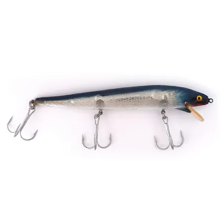 Silber- und Blautöne prägen das Schuppenmuster dieses 14 cm (5 1/2") langen Minnows. Dieses aus den USA stammende Exemplar von Whopper Stopper trägt die Artikelnummer 10564. Mit einem Gewicht von 14 g (1/2 oz) besticht der HELLCAT durch sein schlankes, langgestrecktes Profil und ist mit drei robusten Drillingshaken ausgestattet. Die Tauchschaufel aus klarem Kunststoff trägt den eingeprägten Modellnamen und befindet sich unter den markanten gelben Augen, die einen starken Kontrast zum dunkelblauen Kopf bilden. Das Dekor ist gut erhalten und weist leichte Gebrauchsspuren auf, was zu einer Zustandsbewertung von 4/5 führt. Sammler werden die intakte Hardware und das klassische Profil schätzen, das gezielt für Hecht, Musky oder Streifenbarsch beim Spinnfischen und Schleppangeln eingesetzt wird.