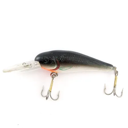Die markante orangefarbene Kinnpartie dieses Köders dient als klassischer Beißpunkt und setzt einen starken Kontrast zum dunklen, schimmernden Körper. Dieser Whopper Stopper Shadrac mit der Artikelnummer 23360 hat eine Länge von 8 cm, wiegt 14 g und wurde speziell für das Wurfangeln im Tiefwasser entwickelt. Das Dekor besticht durch einen tiefschwarzen Rücken, der in silbergraue Flanken übergeht, ergänzt durch ein dezentes grünes Brustflossendetail und einen markanten roten Kiemenstrich. Der in den USA gefertigte Köder befindet sich in einem exzellenten Zustand (5/5), wobei die glänzende Lackierung und die große, transparente Tauchschaufel vollständig intakt sind. Die Drillingshaken sind mit den für diesen Hersteller typischen goldfarbenen Wicklungen am Schenkel versehen.