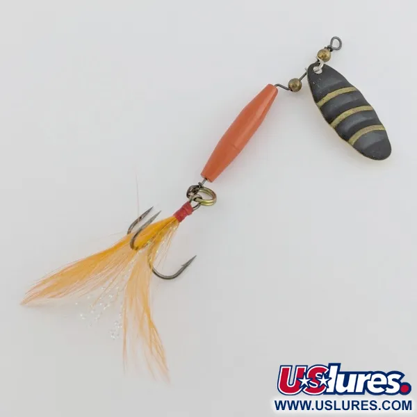 Ein leuchtend orange-roter, zigarrenförmiger Körper bildet das Herzstück dieses klassischen Inline-Spinners und spiegelt die erstklassige Fertigungsqualität der in Stevens Point, Wisconsin, ansässigen Worth Company wider. Da Worth legendär für die Belieferung der gesamten Angelgeräteindustrie mit hochwertigen Komponenten wie Sprengringen und Wirbeln ist, präsentiert ein fertiger Köder wie dieser #301 (Produktcode 24436) ihre Präzisions-Hardware in einem Komplettpaket. Das tropfenförmige Spinnerblatt verfügt über eine markante schwarze Vorderseite mit goldenen, bogenförmigen Streifen, während die Rückseite eine gehammerte Goldstruktur aufweist. Dieses Exemplar im Zustand 5/5 ist mit einem Drillingshaken ausgestattet, der mit orangefarbenen und gelben Federn verziert ist, die durch eine saubere rote Fadenwicklung gehalten werden. Die Montage verwendet kleine Messingperlen und eine spezialisierte Gabel (Clevis), um eine reibungslose Rotation während des gleichmäßigen Einholens in Süßwasserumgebungen auf Forelle oder Barsch zu ermöglichen. Es ist ein solides Beispiel für amerikanische Handwerkskunst aus der Mitte des Jahrhunderts aus dem Herzen des Mittleren Westens.