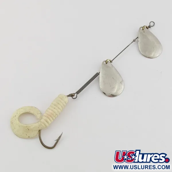 Zwei vernickelte Spinnerblätter in Tropfenform zeichnen den oberen Teil dieses Inline-Rigs aus und sorgen bei gleichmäßigem Einholen für konstante Lichtreflexe. Mit einer Gesamtlänge von 13 cm (5") und einem Gewicht von 5 g (3/16 oz) eignet sich das System hervorragend für das leichte Wurfangeln oder Schleppfischen im Süßwasser. Das Nickel-Finish der Blätter harmoniert mit einem weißen Twisterschwanz, der mit dezenten Silberflocken für zusätzliche optische Reize versehen ist. Rote Lockperlen auf der Drahtachse sorgen für den richtigen Abstand der Blätter und dienen als Fixpunkt in der Nähe der Gabeln. Ein Einzelhaken ist mit dem gerippten Weichplastikschwanz bestückt, der über eine stabile Drahtschlaufe am Rahmen gesichert ist. Der Hersteller Worth hat diese Komponenten mit einer einfachen Öse am Kopf für die direkte Schnurbefestigung oder die Verwendung eines kleinen Snaps versehen. Der Gesamtzustand wird mit 5/5 bewertet, mit sauberen Metalloberflächen und einem geschmeidigen Plastik-Trailer. Unter der Produktnummer 24502 katalogisiert, unterstreicht diese Konfiguration den modularen Charakter klassischer Spinner-Designs.
