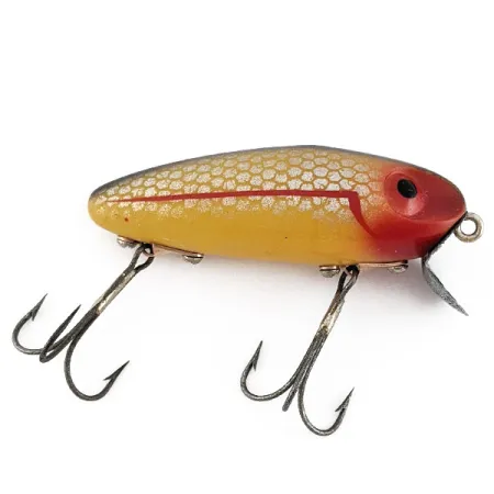 Silberne Schuppendetails bedecken die obere Hälfte des goldgelben Körpers dieser seltenen Vintage-Rarität aus amerikanischer Produktion. Der 7 cm lange Wright & McGill Bug a Boo aus Kunststoff geht in einen leuchtend roten Kopfbereich über, der durch eine rote Seitenlinie betont wird, die kurz vor dem Auge steil nach unten abknickt. Mit einem Gewicht von 12 g ist dieses schwimmende Exemplar (Produktcode 22033) mit einer festen Tauchschaufel aus Metall und Original-Drillingen an stabilen Metallösen ausgestattet. Der Köder befindet sich in einem Zustand von 4/5 und zeigt ein sauberes Finish, das ihn ideal für eine Sammlung oder einen nostalgischen Einsatz am Wasser macht. Die rot-gelbe Farbkombination war in dieser Ära der Köderherstellung ein Klassiker für Angler, die eine hohe Sichtbarkeit suchten.