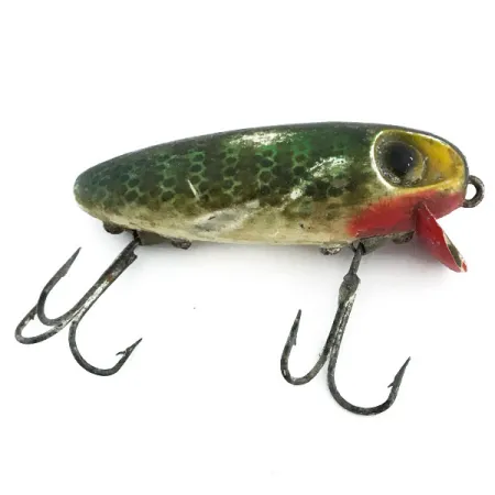 Dieser Köder im klassischen Barsch-Dekor wiegt 12 g (2/5 oz) und weist das charakteristische abgerundete Profil auf, das Sammler alter amerikanischer Angelgeräte sofort wiedererkennen. Mit einer Länge von 7 cm (2 3/4") zeigt der Wright & McGill Bug a Boo ehrliche Gebrauchsspuren von seinen Einsätzen am Wasser, was zu einer charaktervollen Zustandsbewertung von 3/5 führt. Sein Kunststoffkörper ist mit einem tiefgrünen Rücken und schwarzen Schuppenakzenten gestaltet, die in einen cremefarbenen Bauch und einen leuchtend roten Kehlbereich übergehen. Große, vertiefte gelbe Augenhöhlen mit dunklen Pupillen verleihen dem Modell 8896 seinen unverwechselbaren Look. Zur Ausstattung gehören zwei Drillingshaken, die an Oberflächen-Halterungen befestigt sind; während der Körper gut erhalten ist, sind die Haken natürlich gealtert und sollten von Anglern, die einen Einsatz am See planen, ausgetauscht werden. Die rot lackierte Metalltauchschaufel ist in einem steilen Winkel fixiert – ein Konstruktionsmerkmal des US-Herstellers, das die Silhouette dieses besonderen Exemplars prägt.
