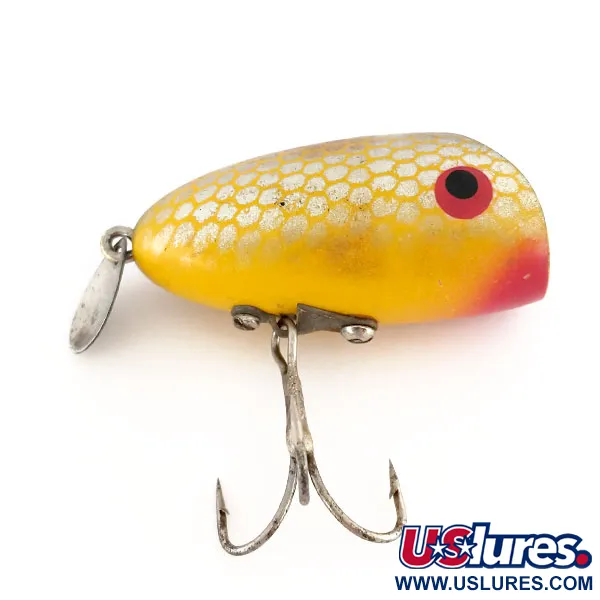 Mit einer Länge von 4,5 cm (1 3/4") ist das kompakte Profil dieses Oberflächenköders ideal für das leichte Spinnfischen. Bekannt als Wright & McGill Rustler, wiegt dieses Exemplar 10 g (1/3 oz) und trägt den Produktcode 9813. Er ist für eine Tiefe von 0 m (0 ft) oder sehr flaches Einholen konzipiert. Der Körper verfügt über ein leuchtend gelbes Finish mit einem darüber liegenden Wabenmuster-Schuppendesign, das auf eine markante schwarze, konkave Front trifft. Ein roter Farbakzent bedeckt das Kinn und umschließt die großen schwarzen Pupillen. Am Schwanz ist ein kleines Metallblatt angebracht, um einen Lichtreflex zu erzeugen, während die Hakenmontage am Bauch über eine spezielle Metallplatte erfolgt, die einen einzelnen Drilling hält. Dieses Exemplar wird im Zustand 5/5 bewertet und bewahrt die klassische Ästhetik alter US-Handwerkskunst.