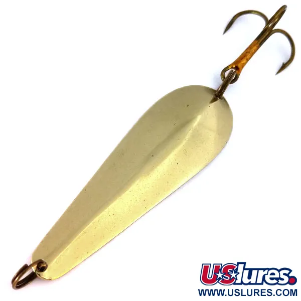 Messingfarbene Töne fangen das Licht auf dem schlanken, länglichen Körper dieses 11g (2/5oz) Blinkers ein. Die Wright & McGill Prägung auf der inneren konkaven Seite weist dieses Modell als echte Streamliner aus, ein klassisches Beispiel amerikanischer Angelgerätekunst der Jahrhundertmitte. Mit einer Länge von 6 cm (2 1/4") verfügt der Blinker über eine beachtliche Materialstärke für weite Würfe. Dieses Exemplar mit der Artikelnummer 10364 ist noch mit den Originalteilen ausgestattet, einschließlich eines brünierten Drillings und stabiler Sprengringe. Das Metallfinish auf dem verjüngten Blatt ist außergewöhnlich gut erhalten, was einen Zustand von 5/5 rechtfertigt. Jede Kurve spiegelt die Fertigungsstandards der USA wider, von der klaren Beschriftung bis zur gleichmäßigen Form des Metalls.