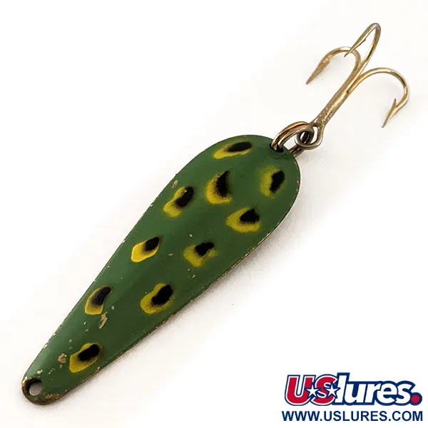Die Basis dieses 4,5 cm (1 3/4") langen, tropfenförmigen Löffelblinkers besteht aus Messing. Die Prägungen von Wright & McGill sowie Streamliner auf der Rückseite sind klar und deutlich lesbar, was dieses Modell mit der Produktnummer 11704 kennzeichnet. Die Vorderseite ist im klassischen „Frog“-Dekor gehalten, mit einer tief olivgrünen Grundfarbe und gelb umrandeten schwarzen Punkten, die natürliche Beute imitieren. Bei einem Gewicht von 7 g (1/4 oz) ist der Köder mit einem goldfarbenen Drilling ausgestattet, der mit einem Sprengring am breiteren Ende des Körpers befestigt ist. Dieses in den USA hergestellte Angelzubehör weist einen Zustand von 5/5 auf; der Emaillack hat seinen ursprünglichen Glanz bewahrt und die Rückseite aus Messing zeigt sich sauber und glänzend. Die Verjüngung des Metalls zur Öse hin deutet auf ein Design hin, das sowohl zum Werfen als auch zum Schleppen in verschiedenen Süßwasserbedingungen geeignet ist.