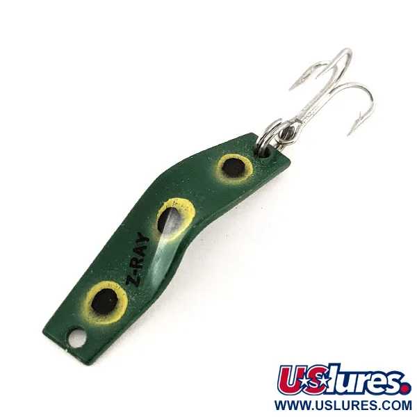 Drei markante schwarze Punkte, umgeben von blassgelben Ringen, zieren den tiefgrünen Körper dieses klassischen Blinkers im Frog-Dekor. Mit einem Gewicht von filigranen 1/8oz (3,6 g) ist dieses Modell von Z-Ray Lures (Artikelnummer 11505) ein hervorragendes Beispiel für die 1 1/2" (3,5 cm) lange Wurfausführung. Der Markenname ist deutlich in schwarzer Tinte auf der Oberseite aufgestempelt, und das gesamte Finish befindet sich in einem exzellenten 5/5-Zustand. Dieses spezielle Design zeichnet sich durch ein einzigartiges Doppelbiegungsprofil aus, das vom US-Hersteller entwickelt wurde, um das Licht anders als herkömmliche flache Blinker zu reflektieren. Ein silberfarbener Drillingshaken ist durch einen robusten Sprengring am hinteren Ende befestigt, während sich an der Spitze eine einzelne Öse für die Schnur befindet. Die Unterseite des Metalls ist einheitlich grün lackiert, passend zur primären Grundfarbe.