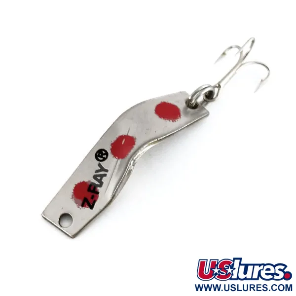 Vernickelt und mit drei markanten roten Punkten versehen, spiegelt die Oberfläche dieses Metall-Blinkers seine US-amerikanischen Wurzeln wider. Dieser 4 cm lange Z-Ray Köder mit der Artikelnummer 9896 ist eine geschätzte Wahl für Angler, die mit leichtem Gerät auf Forellen oder Barsche fischen. In den USA hergestellt, zeichnet sich die Konstruktion durch einen speziell gebogenen Körper und einen scharfen Drillingshaken aus, der per Sprengring befestigt ist. Die Z-RAY® Markierung ist sauber in das Metall eingeprägt, genau zwischen den roten Farbakzenten, die einen optischen Reiz auf dem polierten Finish bilden. Mit einem Gewicht von 4 g eignet sich das kompakte Profil ideal für weite Würfe oder kontrolliertes Jiggen. Dieses Exemplar befindet sich im Zustand 5/5 und behält einen brillanten Glanz sowie präzise Farndetails auf der gesamten Oberfläche bei. Eine kleine Bohrung am Kopf dient der direkten Schnurbefestigung oder für einen kleinen Einhänger, während die Rückseite als glatte, polierte Nickelfläche belassen wurde.
