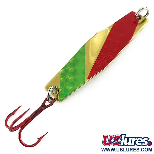 Dreifarbiges Dekor prägt die Vorderseite dieses in den USA gefertigten Blinkers, der auf einer polierten Goldbasis mit lebhaftem roten und grünen Prismen-Schuppenband versehen ist. Mit einem Gewicht von 2/5 oz (11 g) ist der Z-Ray Model 125 ein 2 1/2" (6,5 cm) langer Köder von Z-RAY Lures, erkennbar an der Artikelnummer 7031. Die Vorderseite zeigt geometrische Muster innerhalb der farbigen Abschnitte, die das Licht effektiv einfangen, während die Rückseite in schlichtem, einheitlichem Gold gehalten ist. Zur Ausstattung gehören ein stabiler Sprengring an der Öse und ein markanter rot lackierter Drillingshaken, der einen scharfen visuellen Kontrast zum Metallkörper bildet. Dieses Exemplar befindet sich in exzellentem Zustand (Bewertung 5/5) und zeigt den ursprünglichen Glanz der Goldbeschichtung sowie die Unversehrtheit der klebenden Prismenstreifen. Er ist robust gebaut und sowohl zum Werfen als auch zum Schleppfischen konzipiert.