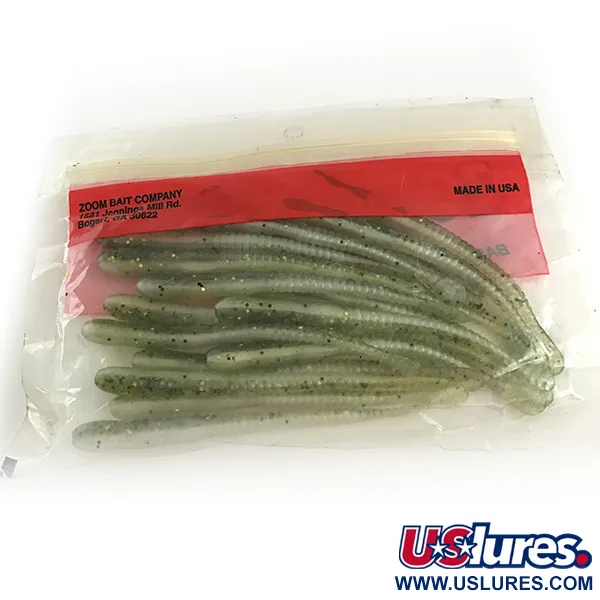 Mit einer Länge von exakt 4" (10 cm) sind diese schlanken Softplastics ein Grundnahrungsmittel für Finesse-Angler, die eine dezente Präsentation suchen. Diese speziellen Zoom Meathead Köder mit dem Produktcode 6667 (gekennzeichnet als 024-114) verfügen über das ikonische Baby Bass Farbschema – eine durchscheinende grüne Basis, die intensiv mit dunklen und schimmernden grünen Flakes versetzt ist. Während die Originalverpackung 20 Stück angibt, enthält dieses Vintage-Set 19 unbenutzte Köder, die ihre ursprüngliche Textur und Optik bewahrt haben. Hergestellt in den USA, nutzt das Design einen gerippten Körperabschnitt, der in einen dünnen, flachen Schwanz übergeht – eine Konfiguration, die oft für Drop-Shot-Montagen oder Split-Shot-Rigs bevorzugt wird. Die Köder befinden sich in unbenutztem Zustand und wirken, als wären sie gerade erst vor Jahrzehnten aus einem Angelgeschäft-Regal genommen worden. Jeder Wurm weist die „Better Than Salt“-Formel auf, die auf der klassischen rot-gelben Header-Karte der Zoom Bait Company erwähnt wird.